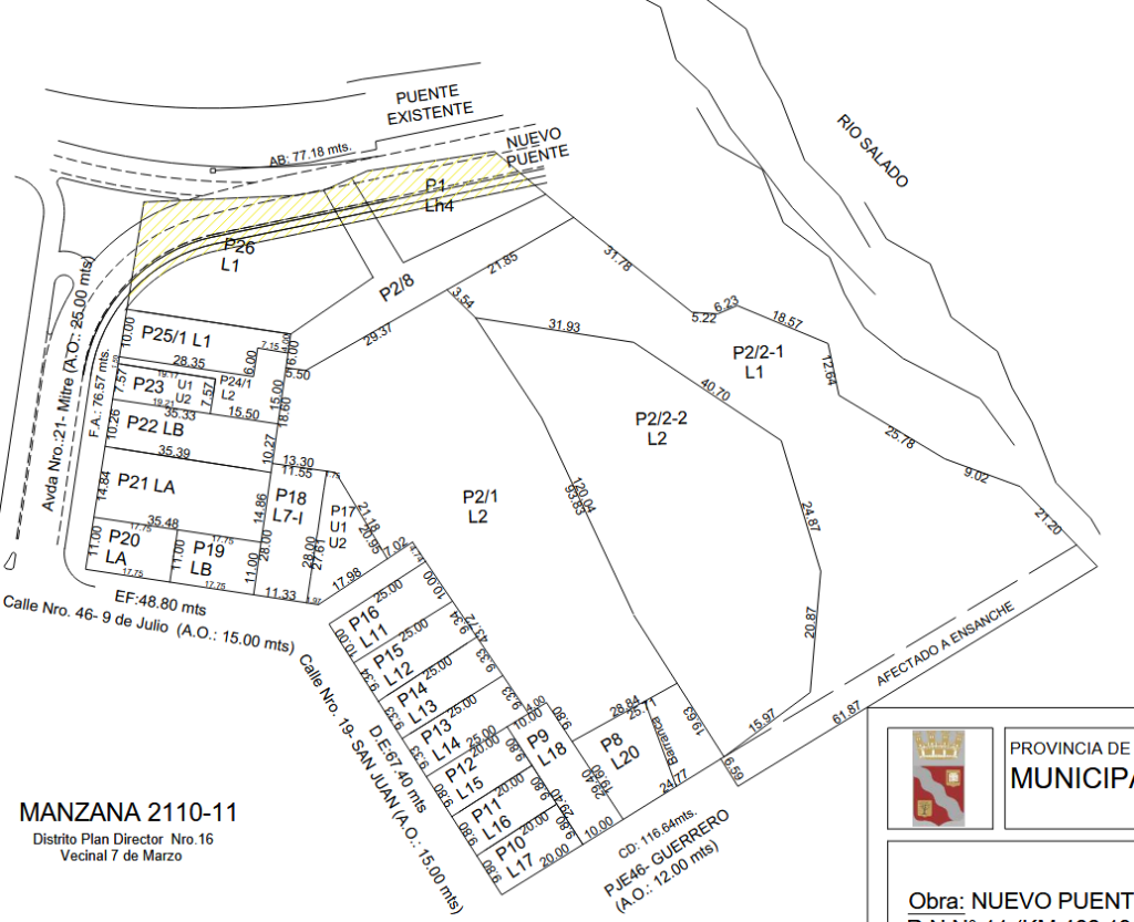 El emplazamiento elegido es aguas abajo del puente existente, con motivo de no interferir en el escurrimiento natural del cauce principal del río evitando de esa forma posibles erosiones sobre las fundaciones del puente actual.