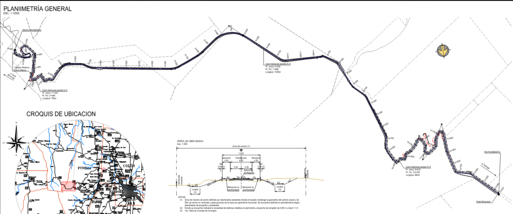 La velocidad directriz adoptada es de 40 km/h, con peralte de 6%, radio de curva mínimo de 55 m, pendiente absoluta máximma de 9% y talud de terraplén 1:3. La calzada pavimentada será de 6.70 m de ancho y pendiente transversal del 2%, con banquinas no pavimentadas de 2.5 m de ancho y pendiente transversal del 4%, arrojando un ancho de coronamiento de 11.70 m total. El ancho de la zona de camino existente es variable, con un mínimo encontrado de 30 m; en las variantes previstas se proyecta un ancho de 50 m.