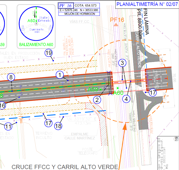 Los cruces con el FFCC y el carril Alto Verde serán mediante un puente, pavimentándose el Carril Alto Verde en este sector, el cual servirá como retorno de las colectoras.