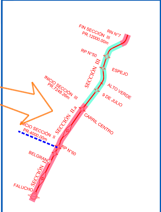 Las calles o rutas que intercepta el trazado son Carril 9 de Julio, Carril Alto Verde, Carril Espejo y RP50. Solamente la RP50 está pavimentada, siendo el resto de ripio. Se ha previsto también en el proyecto una conexión entre colectoras oeste y este antes del cruce del FFCC.