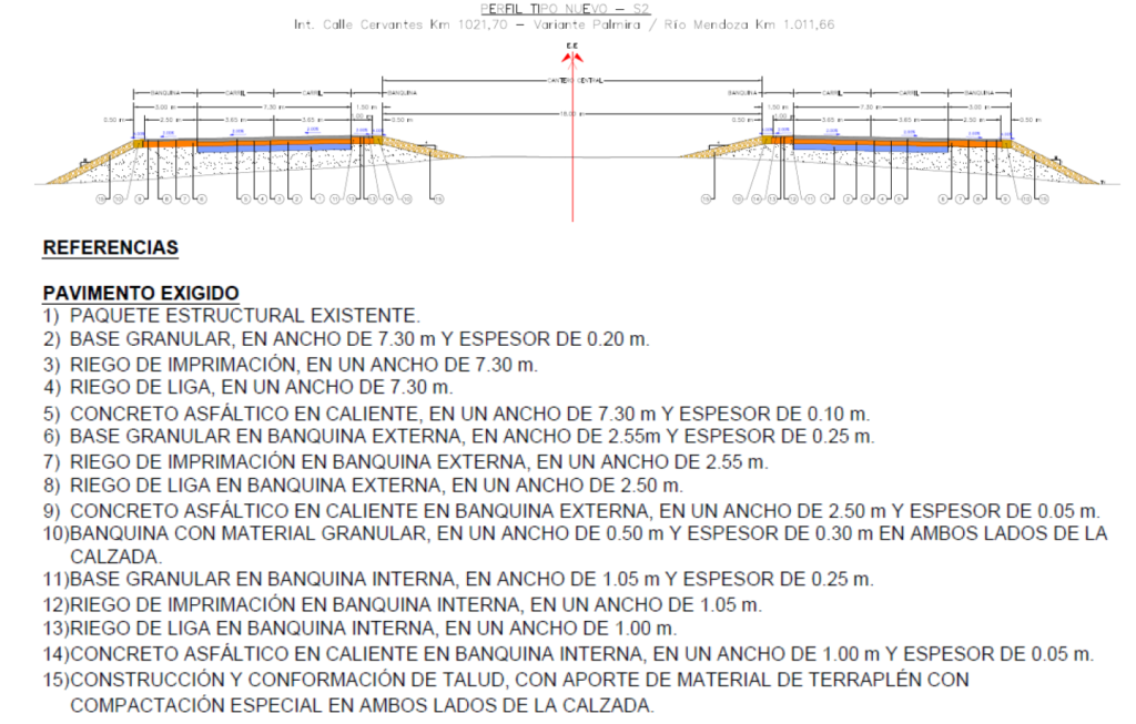 Se proyecta un refuerzo estructural compuesto por una carpeta de concreto asfáltico de 14 cm (dispuesta en 2 capas de 7 cm) y una base de material granular de 20 cm de espesor en todo el ancho del pavimento existente de calzadas principales. También se incluyen trabajos de limpieza en el sector, colocación de señalización horizontal y vertical, colocación de sistema de contención lateral donde sea necesario y mantenimiento de infraestructura complementaria.