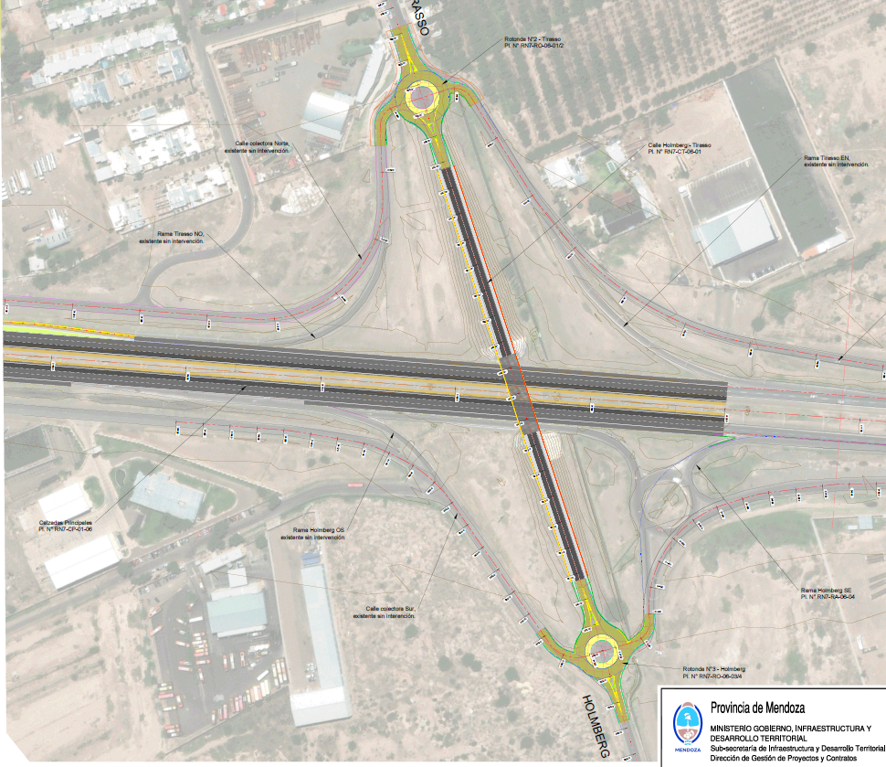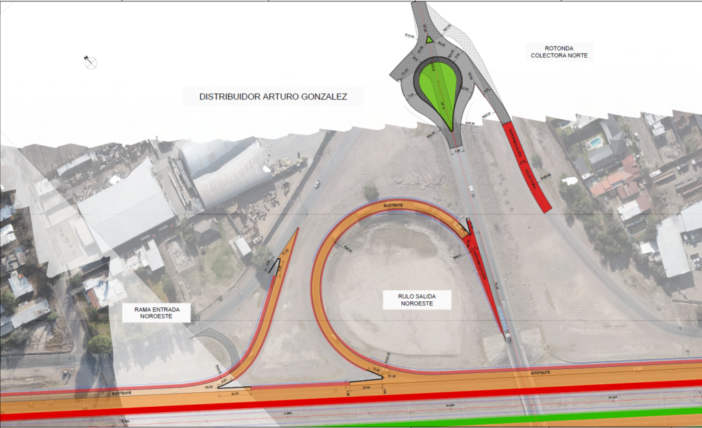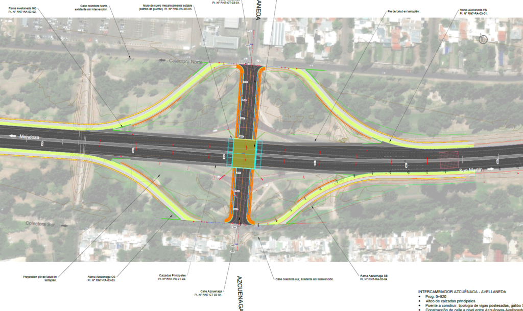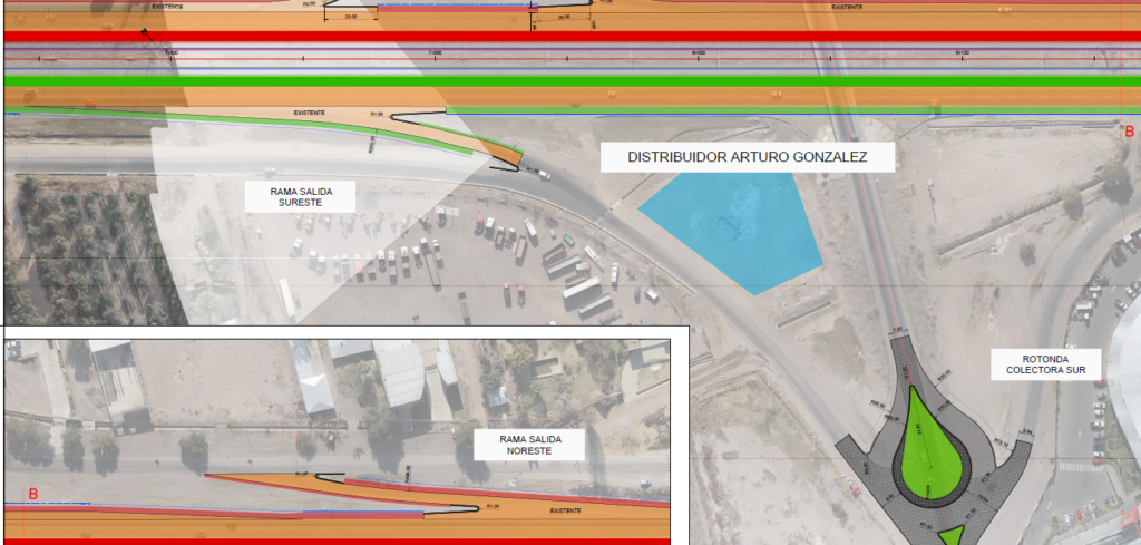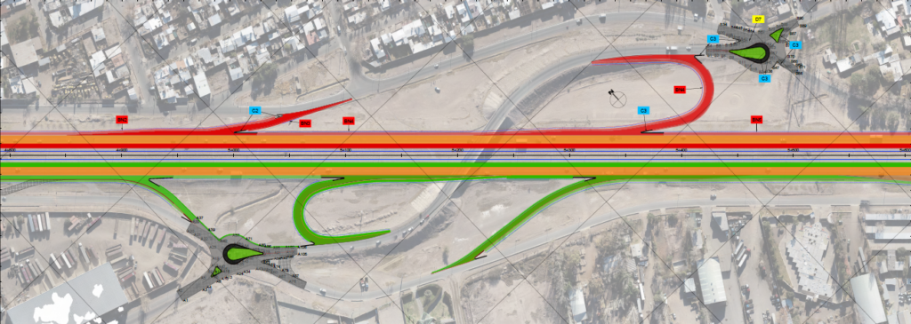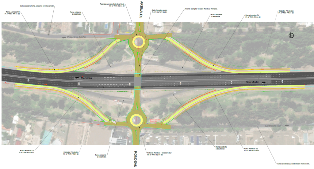 Los accesos a colectoras norte y sur, que estaban planteados para colectoras de doble sentido, se rediseña para colectoras de un solo sentido de circulación. Además, se suavizan un poco las curvas de acceso. El sector celeste que se aprecia es lo que se denomina una laguna de contención, que aloja el agua de lluvias para dar tiempo a que desagote por los canales.
