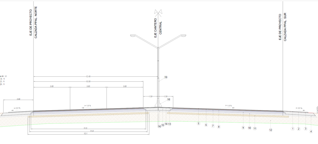 No se modifica la estructura actual de puente en la calle. Las banquinas externas tendrán 2.5 m de ancho. En el cruce con las colectoras se agregan rotondas, tanto en la norte como en la sur, mientras que se elimina la rotonda actual existente en el sur pero mucho más cerca de la calzada principal que las propuestas; a causa de esto, el acceso sur a la calzada con sentido este se aleja de la incorporación actual.