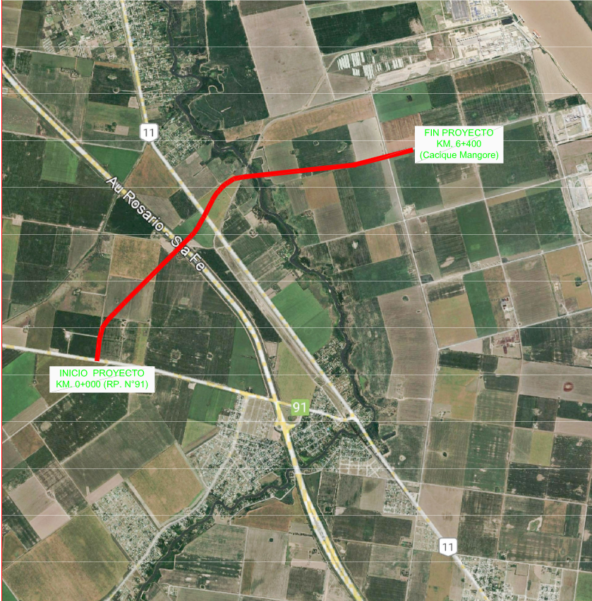 Apertura de un camino entre RP91 y calle Cacique Mangoré para que sirva de desvío de tránsito pesado al norte de Timbúes. La calle estará pavimentada hasta RN11 y desde allí es de tierra. Incluye una rotonda en RP91, y un nuevo puente sobre la RN11 y vías del FFCC, y otro sobre el río Carcarañá.