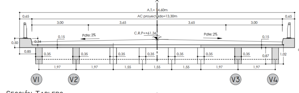 El trabajo consiste en todos los casos romper los cordones laterales y parte de la losa de tablero en los bordes, para poder empalmar el nuevo hormigón con el existente. Se extiende la losa hacia ambos lados conservando el espesor original (15 cm), y se incorporan nuevos cordones laterales de 65 cm de ancho. Se extienden las viguetas internas existentes, manteniendo anchos y alturas.