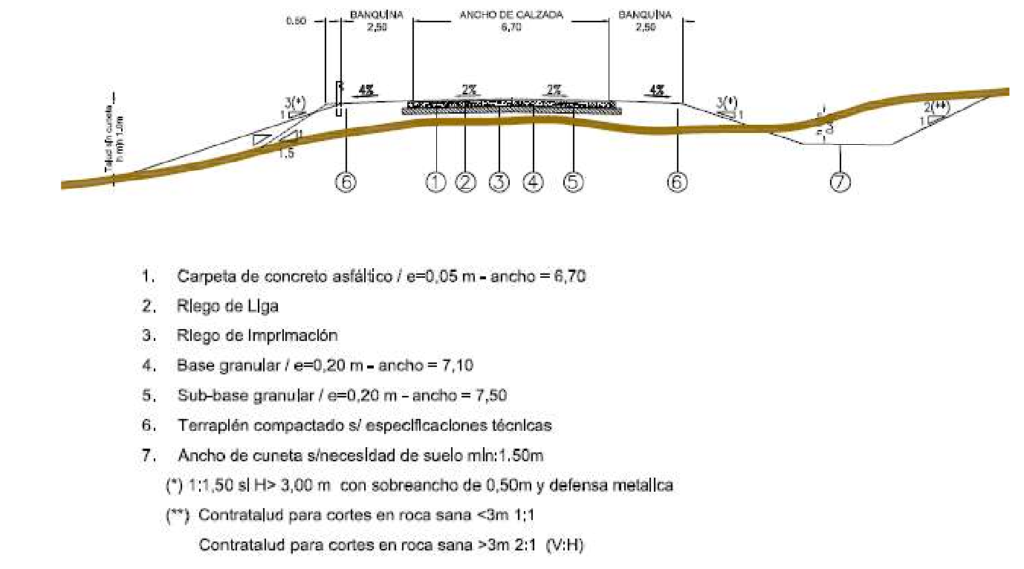 El perfil tipo tiene un ancho de calzada pavimentada de 6.70 m y banquinas sin pavimentar de 2.5 m, con una pendiente transversal del 4%, logrando un ancho total de 11.70 m. La carpeta asfáltica tendrá 5 cm de espesor, y tanto la base granular como la sub-base granular serán de 20 cm cada una.