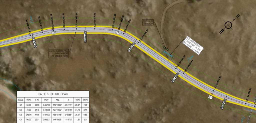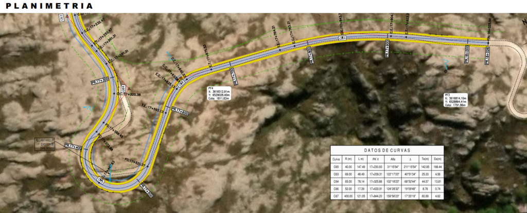 La traza del proyecto sigue en general el camino existente, y se rectifican curvas de forma tal de mantener una velocidad de entre 40 km/h y 50 km/h. El diseño geométrico es compatible con las características del terreno y las curvas proyectadas tienen radios superiores a 50 metros (excepcionalmente de 40 metros) y espirales de transición. Se agregan a la vía proyectada cuatro tramos de sobrepaso (dos en cada sentido) de 600m de longitud aproximadamente en las trepadas más pronunciadas. La zona de camino se extenderá a 40 metros, centrados en la traza del proyecto para toda la longitud del tramo.