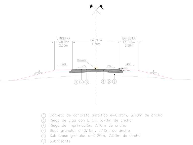 Se prevé la ejecución de pavimento asfáltico de 5 cm, más una subbase granular de 20 centímetros y una base
