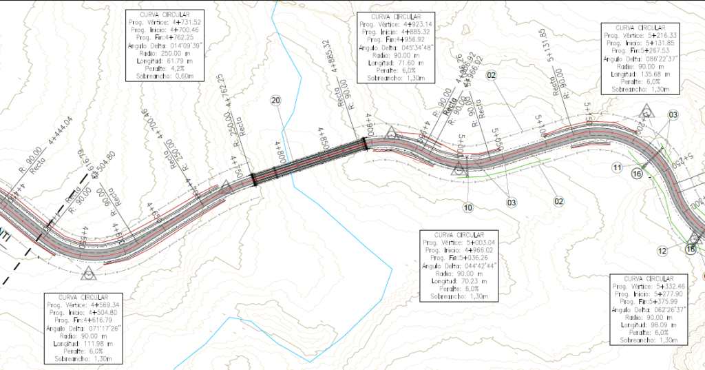 La velocidad directriz es de 60 km/h hasta la progresiva 4+100, a partir de la cual baja a 50 km/h, con una curva puntual donde se reduce a 40 km/h. Para el caso de la altimetría, se han adoptado valores de pendientes máximas de 5% deseable y 7% absoluto.